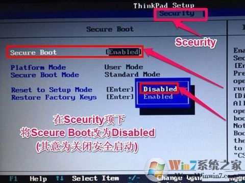 2、按→方向鍵移動(dòng)到Security,將secure boot改成disabled,關(guān)閉安全啟動(dòng),如圖所示: