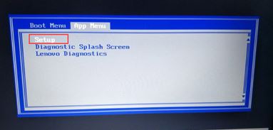 1、重啟筆記本按F12,按TAB鍵切換欄目到"App Menu",然后選擇"setup"進(jìn)入BIOS設(shè)置,或是看到lenovo或ThinkPad標(biāo)識(shí)后多次按Enter回車(chē),聽(tīng)到報(bào)警聲后等待下一畫(huà)面,然后按F1或Fn+ F1進(jìn)入BIOS主界面。如下圖所示: