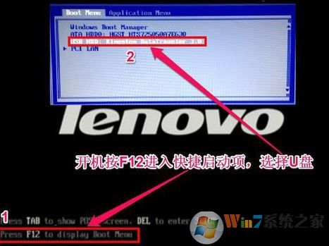 5、保存設(shè)置后自動(dòng)重啟進(jìn)入LOGO畫面時(shí),一直按F12,選擇U盤啟動(dòng),如下圖所示;
