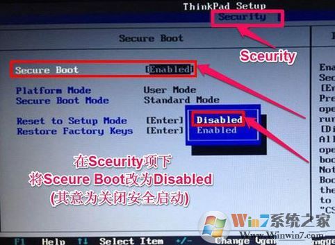 2、按→方向鍵移動(dòng)到Security,將secure boot改成disabled,關(guān)閉安全啟動(dòng),如下圖所示;