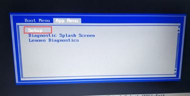 1、重啟筆記本按F12,按TAB鍵切換欄目到"App Menu",然后選擇"setup"進(jìn)入BIOS設(shè)置,或是看到lenovo或ThinkPad標(biāo)識(shí)后多次按Enter回車,聽到報(bào)警聲后等待下一畫面,然后按F1或Fn+ F1進(jìn)入BIOS主界面。如下圖所示;