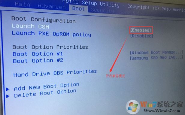 2、重啟后切換到BOOT的選項(xiàng),把Launch CSM由disabled改成enabled,開啟兼容模式;
