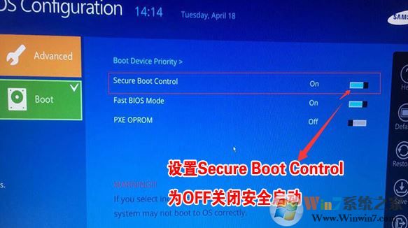 2、切換到BOOT的選項,將Secure Boot Control后面的開關(guān)關(guān)掉(On變成Off),關(guān)閉安全啟動,該步是改WIN7的重要一步,如下圖所示;