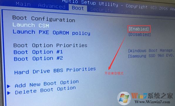 2、重啟后切換到BOOT的選項(xiàng),把Launch CSM由disabled改成enabled,開(kāi)啟兼容模式;