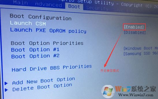 2、切換到BOOT的選項,把Launch CSM由disabled改成enabled,開啟兼容模式,然后按F10保存設置;