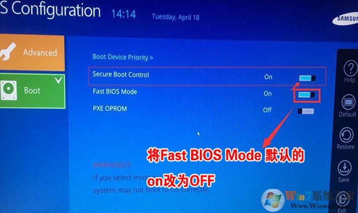 4、將Fast BIOS Mode后面的開(kāi)關(guān)關(guān)掉(On變成Off),如下圖所示;