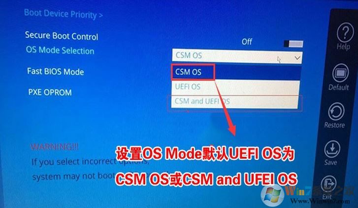 3、關(guān)閉安全啟動(dòng)后,BOOT選項(xiàng)中就會多出一個(gè)OS Mdoe Selection選項(xiàng),我們將默認(rèn)的UEFI OS改為CSM OS或CSM and UEFI OS,如下圖所示;