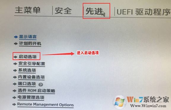 5、F10保存重啟后再次開(kāi)機(jī)按ESC,然后選擇F10進(jìn)入BIOS設(shè)置,將鼠標(biāo)移動(dòng)“先進(jìn)”選項(xiàng)中,選擇"啟動(dòng)選項(xiàng)"后回車進(jìn)入,如下圖所示;