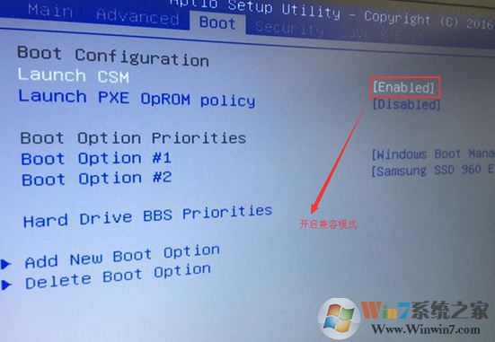 2、切換到BOOT的選項(xiàng),把Launch CSM由disabled改成enabled,開啟兼容模式,然后按F10保存設(shè)置;