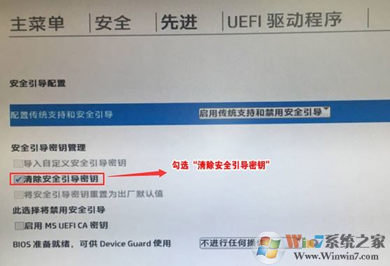 4、F10保存重啟后再次開機(jī)按ESC,然后選擇F10進(jìn)入BIOS設(shè)置,將進(jìn)入剛設(shè)置的地方,勾選“清除安全引導(dǎo)密鑰”,然后再次F10保存;