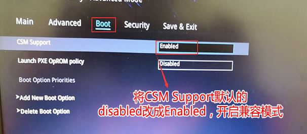 3、再切換到BOOT的選項,把CSM support由disabled改成enabled,開啟兼容模式,如圖: