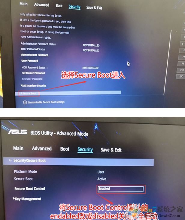 2、進(jìn)入高級模式后,按→方向鍵移動到Security,選擇Secure Boot,然后回車進(jìn)入把Secure Boot control選enabled改為disabled關(guān)閉安全啟動,如圖:
