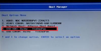 5、插入U(xiǎn)盤(pán)啟動(dòng)盤(pán),重啟時(shí)不停的按下f12,打開(kāi)Boot Manager,選擇USB HDD回車(chē)從U盤(pán)啟動(dòng),如下圖所示;