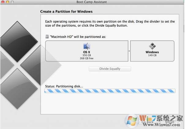 2、然后再打開bootcamp只勾選安裝Windows,再分區(qū)試試,嘗試調(diào)節(jié)分區(qū)大??;