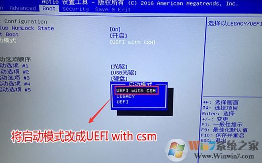 1、開(kāi)機(jī)一直按按DEL進(jìn)入BIOS界面,然后利用方向鍵上下左右來(lái)選擇選項(xiàng),切換到選擇Boot選項(xiàng),然后利用方向鍵的下鍵移動(dòng)啟動(dòng)模式(Boot mode select)將UEFI改成UEFI with CSM如下圖所示;