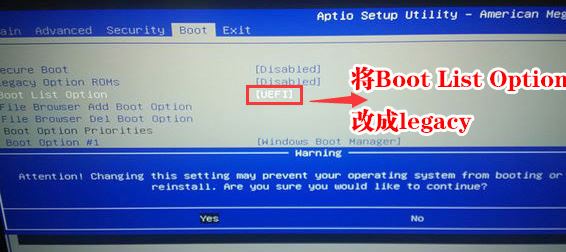 3、接著將boot list optaion的模式uefi改成legacy,如下圖所示;