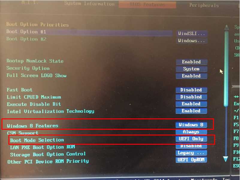 2、如下圖,將Windows8 features 設(shè)置為Windows8 將 Boot Mode Selection 設(shè)置為 UEFI Only ;