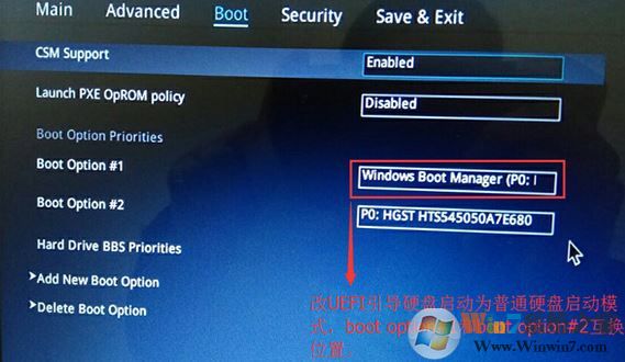 4、繼續(xù)把boot option#1選項改為普通引導(dǎo)的,boot option#1和boot option#2硬盤啟動位置對換,設(shè)置第一啟動項為普通硬盤引導(dǎo),帶Windwos Boot Manager的為UEFI引導(dǎo)分區(qū),然后按F10保存設(shè)置;