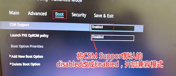 3、再切換到BOOT的選項,把CSM support由disabled改成enabled,開啟兼容模式,;