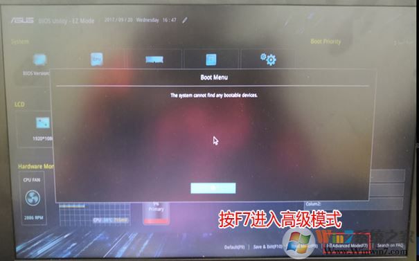 1、重啟筆記本按esc進(jìn)入BIOS設(shè)置,然后按F7進(jìn)入高級模式,如下圖所示;