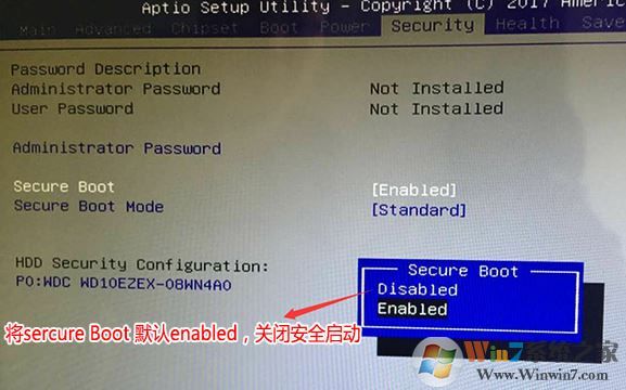 1、重啟筆記本按delete進(jìn)入BIOS設(shè)置,在Security下把Secure Boot Control設(shè)置為Disabled,關(guān)閉"安全啟動"如下圖所示,然后按F4保存更改重啟;