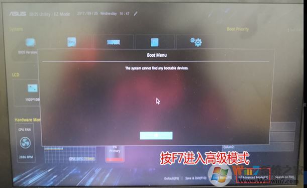 1、重啟筆記本按esc進(jìn)入BIOS設(shè)置,然后按F7進(jìn)入高級(jí)模式,如圖: