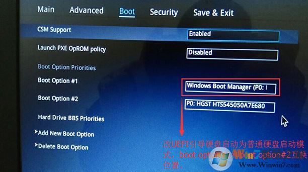 4、繼續(xù)把boot option#1選項(xiàng)改為普通引導(dǎo)的,boot option#1和boot option#2硬盤啟動(dòng)位置對(duì)換,設(shè)置第一啟動(dòng)項(xiàng)為普通硬盤引導(dǎo),帶Windwos Boot Manager的為UEFI引導(dǎo)分區(qū),然后按F10保存設(shè)置,如圖: