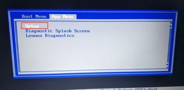 1、重啟筆記本按F12,按TAB鍵切換欄目到"App Menu",然后選擇"setup"進(jìn)入BIOS設(shè)置,或是看到lenovo或ThinkPad標(biāo)識(shí)后多次按Enter回車,聽(tīng)到報(bào)警聲后等待下一畫(huà)面,然后按F1或Fn+ F1進(jìn)入BIOS主界面。如下圖所示;