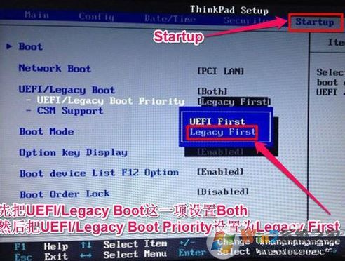3、選擇startup,在UEFI/legac boot priority下,設(shè)置為L(zhǎng)egacy First(傳統(tǒng)模式優(yōu)先)。