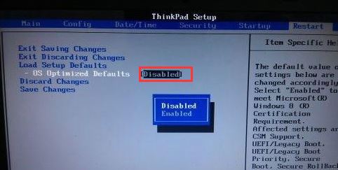 4、在Restart下,選擇OS Optimized Defaults回車,改成Disabled或Other OS,接著選擇Load Setup Defaults回車進(jìn)行加載,然后按F10保存設(shè)置。