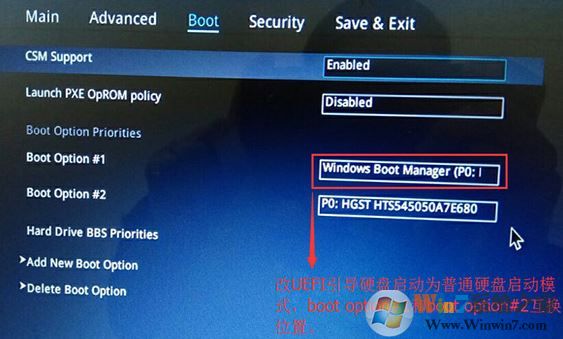 4、繼續(xù)把boot option#1選項改為普通引導的,boot option#1和boot option#2硬盤啟動位置對換,設置第一啟動項為普通硬盤引導,帶Windwos Boot Manager的為UEFI引導分區(qū),然后按F10保存設置;