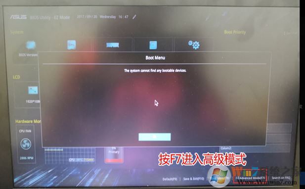 1、重啟筆記本按esc進入BIOS設置,然后按F7進入高級模式,如圖: