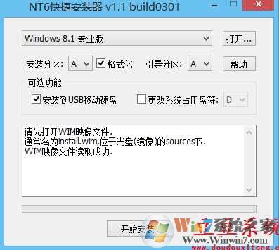 4、打開NT6快捷安裝器,以管理員身份運(yùn)行,點(diǎn)擊打開,選擇剛剛復(fù)制出來的install.win,選擇好分區(qū),勾選安裝到USB移動硬盤,點(diǎn)擊安裝。(建議安裝過程中退出360之類的安全工具,避免影響正常安裝)