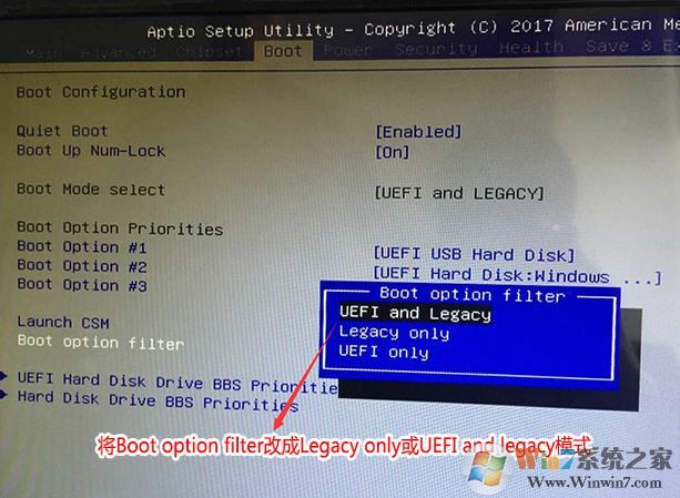 2、重啟后再按delete,進(jìn)入選擇Boot選項(xiàng),將Boot option filer回車設(shè)置成legacy only或uefi and legacy,如下圖所示;