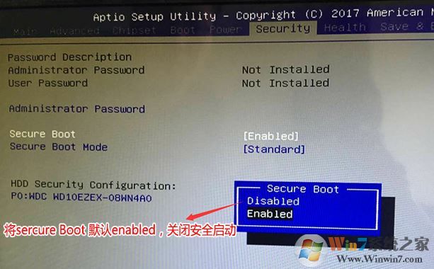 1、重啟筆記本按delete進(jìn)入BIOS設(shè)置,在Security下把Secure Boot Control設(shè)置為Disabled,關(guān)閉"安全啟動(dòng)"如下圖所示,然后按F4保存更改重啟;