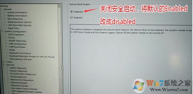 1、開機一直按F2進入BIOS,按F2進入BIOS界面,切換到secure BOOT頁面,選擇secure Boot Enable按回車改成Disabled,如圖所示;