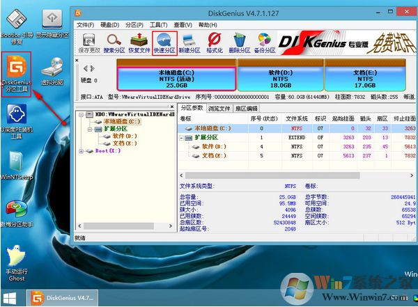 進(jìn)入win8pe桌面后,雙擊“DiskGenius分區(qū)工具”,在diskgenius分區(qū)工具主菜單欄上點(diǎn)擊“快速分區(qū)”如圖所示: