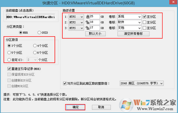 3、在彈出的窗口中選擇“分區(qū)數(shù)目”,在高級(jí)設(shè)置中可以設(shè)置磁盤格式、大小、卷標(biāo)以及主分區(qū),修改完成后點(diǎn)擊“確定”即可;如下圖所示: