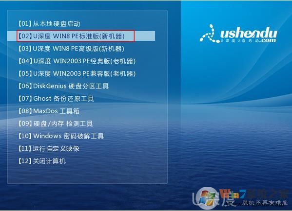 1、將制作好的u盤啟動(dòng)盤連接到電腦usb接口,重啟電腦等待出現(xiàn)開機(jī)界面瞬間按下啟動(dòng)快捷鍵,系統(tǒng)會(huì)進(jìn)入到啟動(dòng)項(xiàng)選擇窗口,然后選擇u盤啟動(dòng)后,系統(tǒng)進(jìn)入至u深度主菜單,選擇【02】u深度Win8PE標(biāo)準(zhǔn)版(新機(jī)器),按下回車鍵確認(rèn),如圖所示: