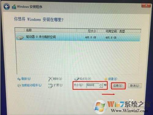 2、然后我們要?jiǎng)?chuàng)建第一個(gè)分區(qū),也就是大家安裝系統(tǒng)的分區(qū),輸入分區(qū)的大小 1000M=1G 然后應(yīng)用;