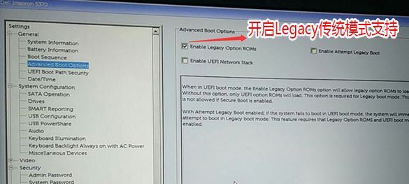 3、切換到Advanced Boot Options將右邊的Enable legacy option roms選項打勾,如下圖所示;
