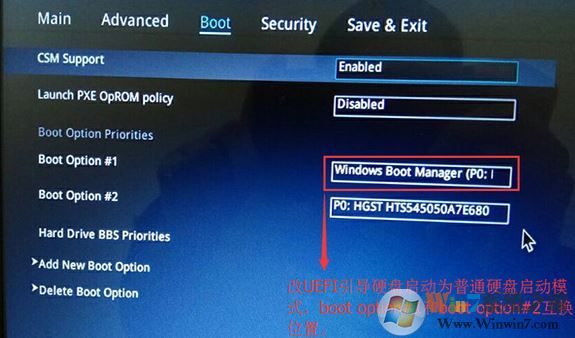 4、繼續(xù)把boot option#1選項(xiàng)改為普通引導(dǎo)的,boot option#1和boot option#2硬盤啟動(dòng)位置對(duì)換,設(shè)置第一啟動(dòng)項(xiàng)為普通硬盤引導(dǎo),帶Windwos Boot Manager的為UEFI引導(dǎo)分區(qū),然后按F10保存設(shè)置,如圖: