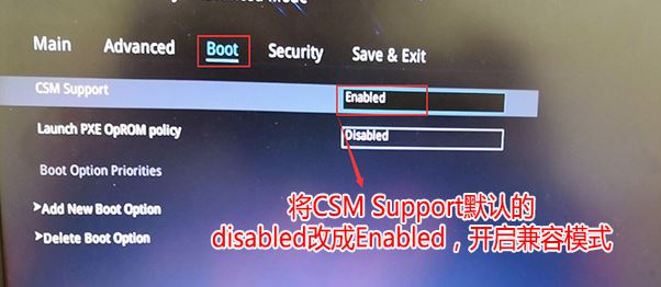 3、再切換到BOOT的選項(xiàng),把CSM support由disabled改成enabled,開(kāi)啟兼容模式,如圖:
