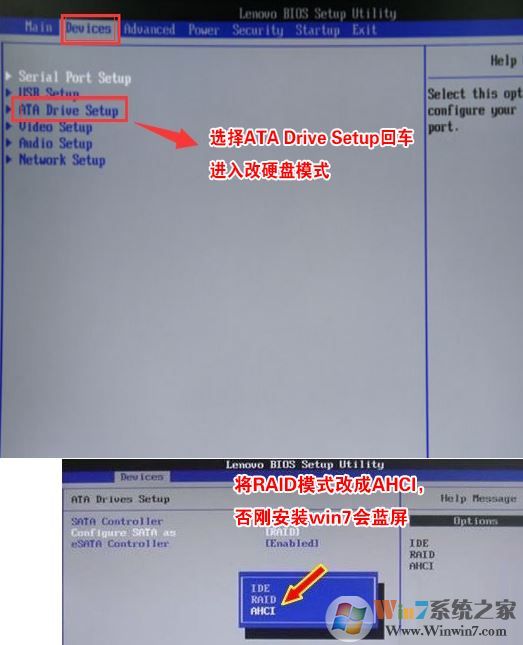 4、將鍵盤移動Devices選項(xiàng),把鍵盤移動ATA Drive Setup回車,將configure SATA as中默認(rèn)的raid改成ahci模式,否則安裝win7時(shí)會出現(xiàn)0x0000007b藍(lán)屏,因?yàn)閣in7中沒有集成raid硬盤驅(qū)動,然后選擇F10保存設(shè)置,在彈出的選項(xiàng)中選擇YES,如下圖所示;