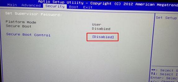 1、重啟筆記本按F2進(jìn)入BIOS設(shè)置,在Security下把Secure Boot Control設(shè)置為Disabled,如下圖所示;