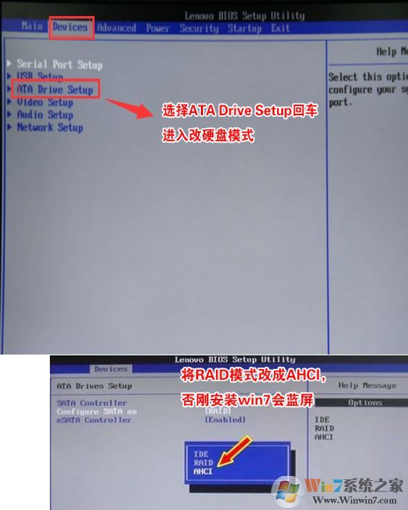 4、切將鍵盤移動(dòng)Devices選項(xiàng),把鍵盤移動(dòng)ATA Drive Setup回車,將configure SATA as中默認(rèn)的raid改成ahci模式,否則安裝win7時(shí)會(huì)出現(xiàn)0x0000007b藍(lán)屏,因?yàn)閣in7中沒(méi)有集成raid硬盤驅(qū)動(dòng),然后選擇F10保存設(shè)置,在彈出的選項(xiàng)中選擇YES,如下圖所示;