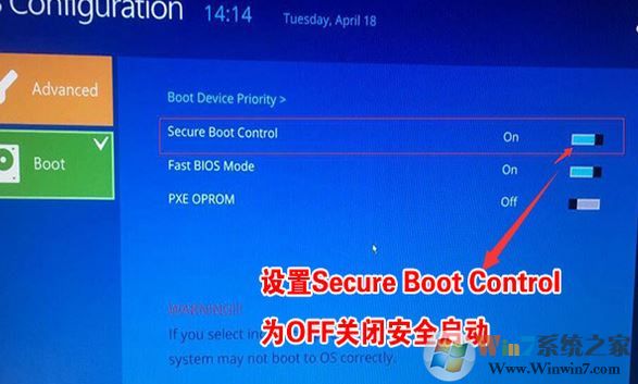 2、切換到BOOT的選項,將Secure Boot Control后面的開關(guān)關(guān)掉(On變成Off),關(guān)閉安全啟動,該步是改WIN7的重要一步,如下圖所示;