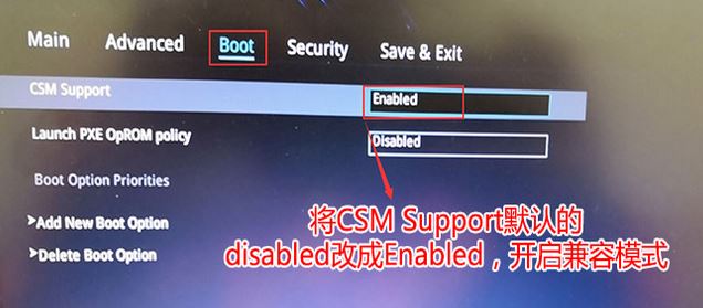 3、重啟后切換到BOOT的選項,分別把fast boot和csm support由disabled改成enabled,分別開啟快速啟動和兼容模式;
