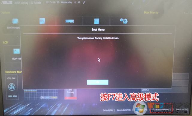 1、重啟筆記本按esc進入BIOS設(shè)置,然后按F7進入高級模式,如下圖所示;