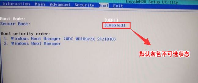 1、開機一直按F2進入BIOS,按F2進入BIOS界面,首先我們要關(guān)閉安全啟動(secure boot選項默認為enabled),切換BOOT項后發(fā)現(xiàn)secure boot灰色不可選狀態(tài),如下圖所示;